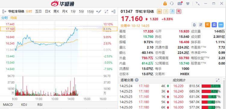 华盛资讯10月12日消息,港股半导体板块午后拉升反弹,截至发稿,华虹半导体涨逾8%,报17.16港元,成交额2.381亿港元,换手率1.11%。上海复旦涨超3%,ASM太平洋涨超2%,中芯国际跌幅收窄至2%。