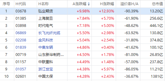 截至A股收盘,AH股涨幅前10如下: