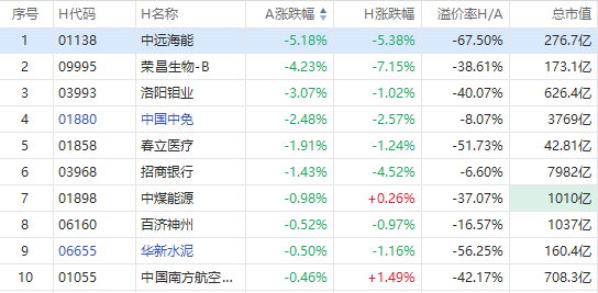 中远海能A股跌5.18%,H股现跌5.38%;荣昌生物A股跌4.23%,H股现跌7.15%;中国中免A股跌2.48%,H股现跌2.57%。