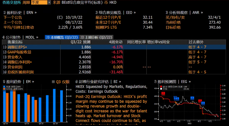 据彭博分析师预期,港交所 $00388.HK 2022年Q3营收为44.06亿港元,调整后净利润为23.07亿港元,调整后EPS为1.886港元。近期共32位分析师给出“买入”评级,目标价392.66港元。
