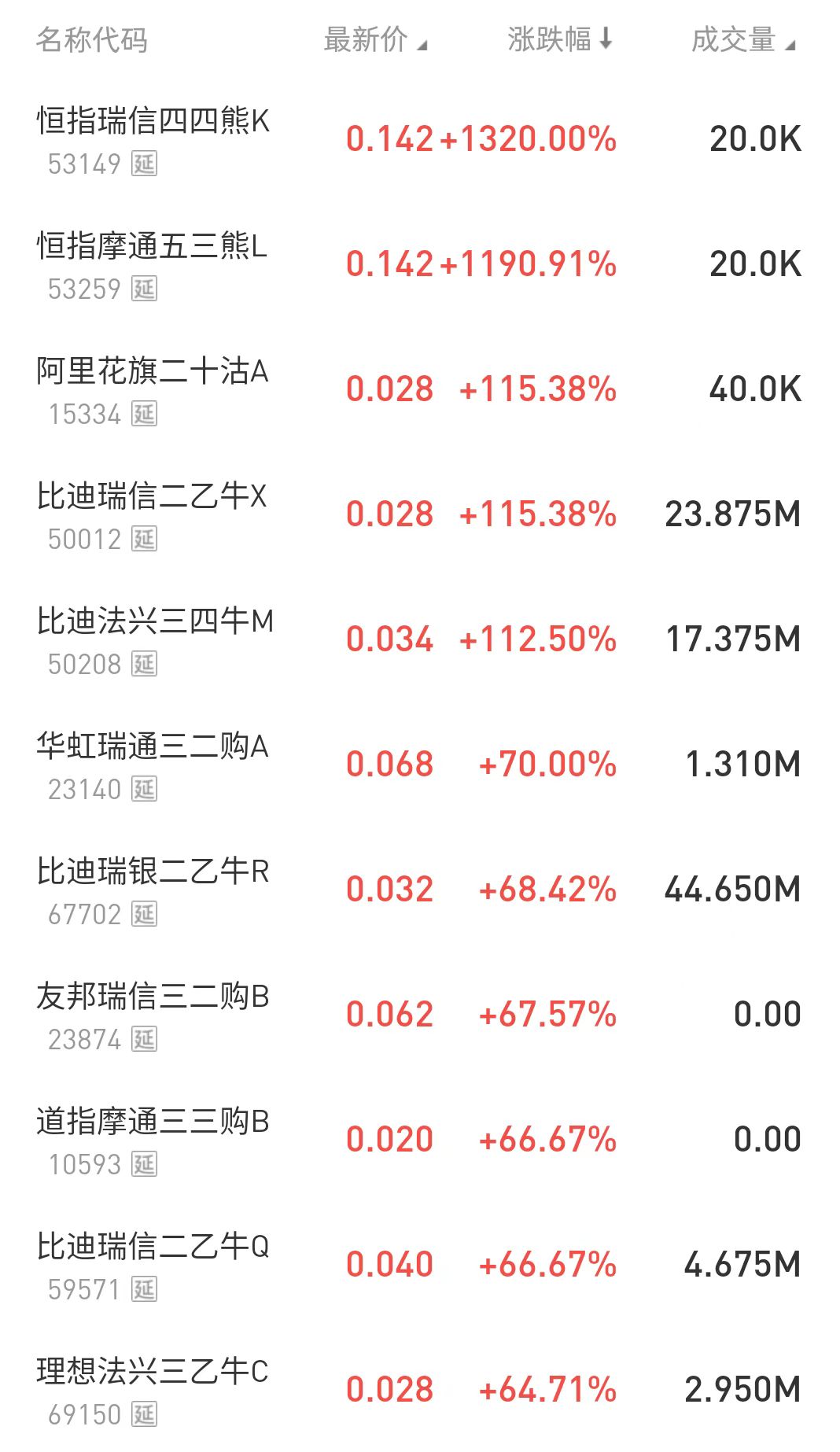 在今日涨幅榜中,恒指瑞信四四熊K $53149.HK 涨1320%,阿里花旗二十沽A $15334.HK 涨115.38%,此外,比迪瑞信二乙牛X $50012.HK 涨115.38%。