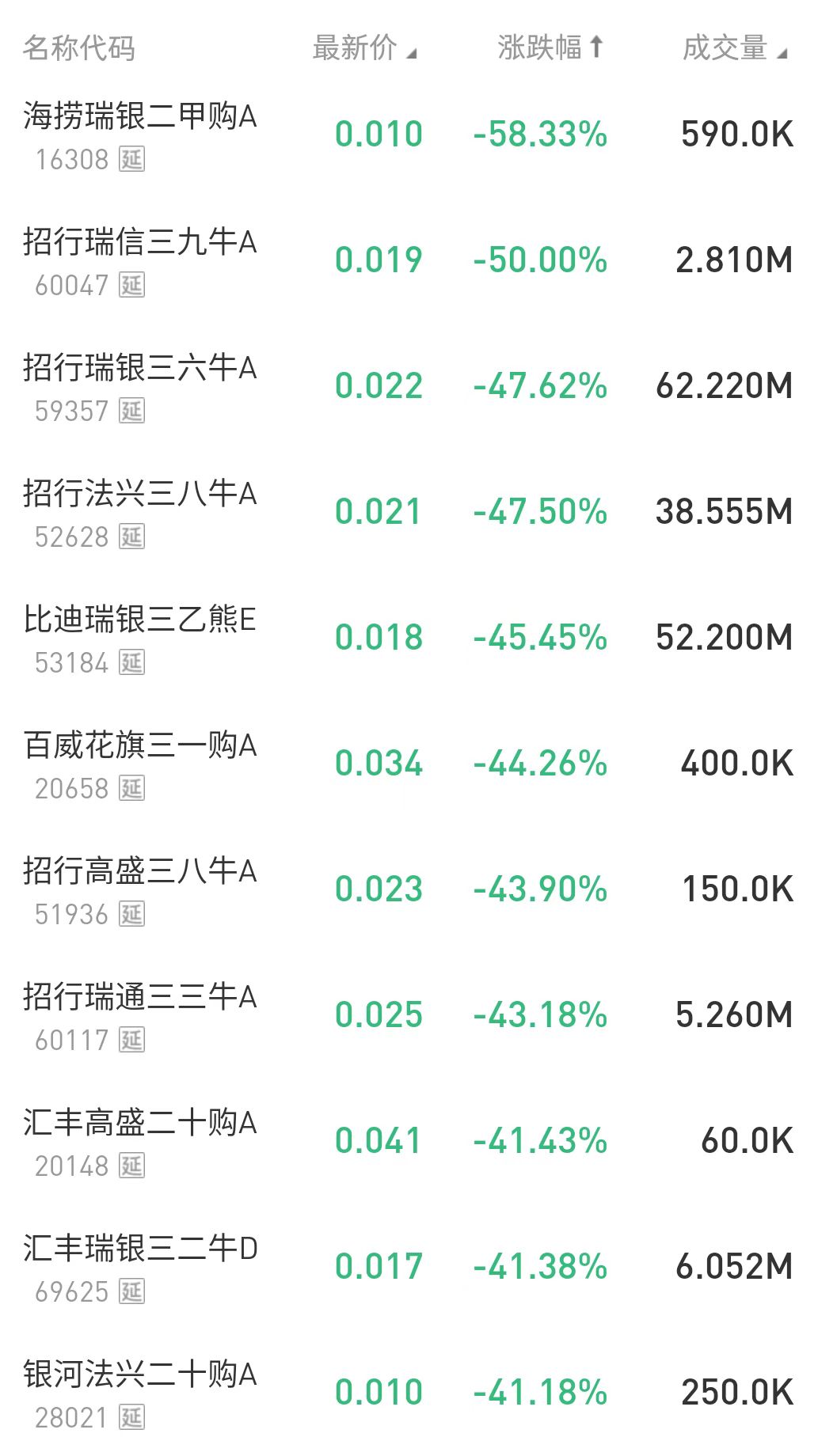 在今日跌幅榜中,海捞瑞银二甲购A $16308.HK 跌58.33%;招行瑞信三九牛A $60047.HK 跌50%。