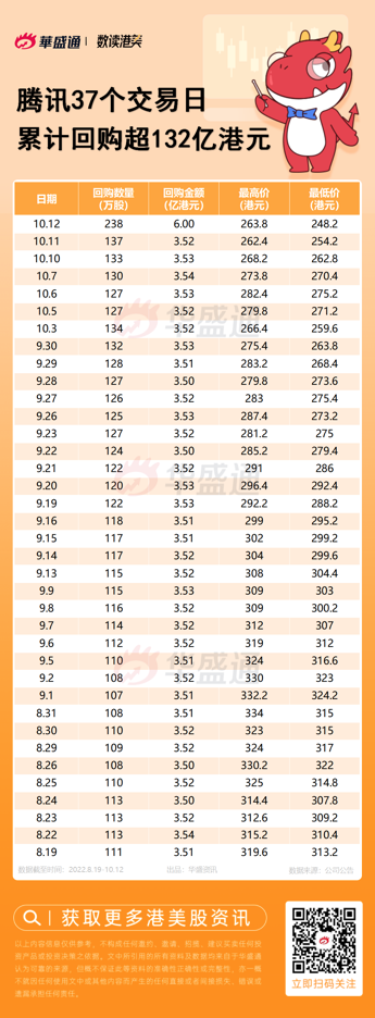 腾讯控股于今日(10月12日)回购238万股,回购价格为248.2-263.8港元,共耗资约6亿港元。自2022年8月19日以来,腾讯已连续37个交易日回购,共计4523万股,耗资132.68亿港元。腾讯年内累计回购次数已达74次,回购金额为232.81亿港元。