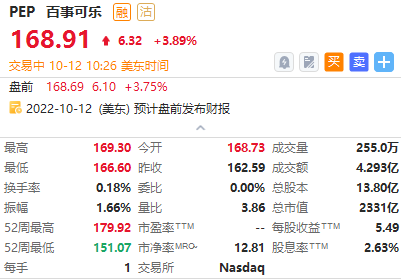 百事可乐涨超3%,Q3营收同比增长8.8%超预期,公司上调全年业绩指引。