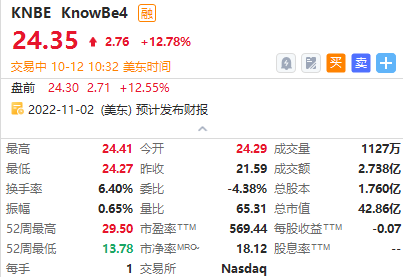 KnowBe4早盘涨超12%,该公司周三宣布,它已达成最终协议,将被 Vista Equity Partners 以股权价值约 46 亿美元的全现金交易方式收购。