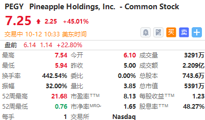 Pineapple Energy $PEGY 今日持续上涨,现涨超45%,报7.25美元;该公司提供可持续太阳能、备用电源和安全输出控制和功耗预测功能,主要面向家庭,并具有降低公用事业成本的效果。