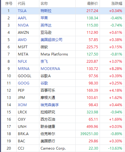 以下为美股当日交易最活跃的20只股票(按成交额):