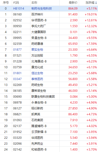 华盛资讯10月13日消息,港股早市生物医药股爆发,百济神州涨19%,科济药业涨近10%,君实生物、荣昌生物、药明康德涨超6%,永泰生物、微创医疗等涨超5%。
