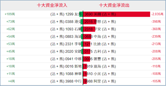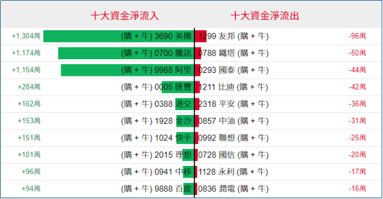 好仓(认购证及牛证)方面,周三美团、腾讯、阿里、比迪等相关好仓分别获1304万、1174万、1154万港元资金净流入。