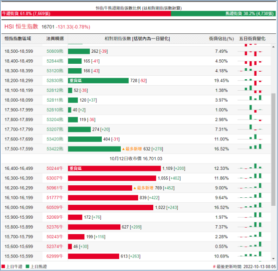 街货分布方面,至周三,恒指牛证街货在收回价16000点至16500点之间,累计相当约4797张期指合约;恒指熊证街货在收回价17500点至18300点之间,累计相当约2369张期指合约。
