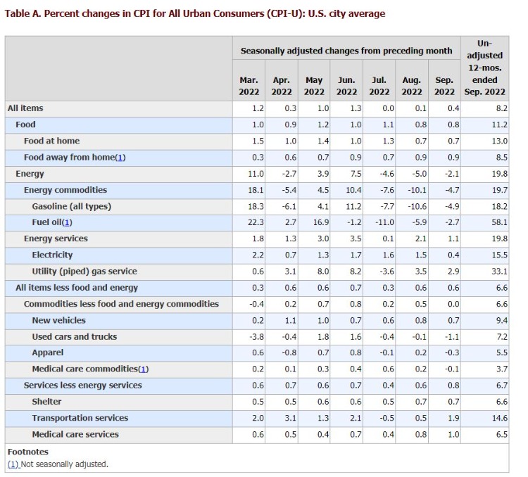 北京时间周四20:30,美国劳工统计局(Bureau of Labor Statistics)公布的数据显示,美国9月未季调CPI年率录得8.2%,高于预期的8.1%。美国9月未季调核心CPI年率录得6.6%,高于预期的6.5%,为1982年8月以来最高。美国至10月8日当周初请失业金人数录得22.8万人,为2022年9月1日当周以来新高。