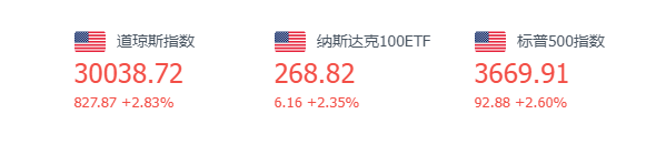 美国三大股指全线收涨,道指涨2.83%报30038.72点,标普500指数涨2.6%报3669.91点,纳指涨2.23%报10649.15点。