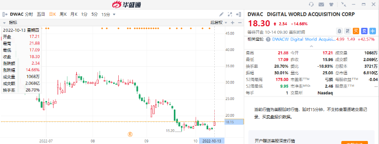 10月13日, $DWAC 周四涨近15%。此外,谷歌方面表示,已批准将美国前总统特朗普支持的Truth Social于其Play商店上架。这款社交媒体应用程序先前因内容审核问题而被禁止进入 Play 商店,现用户已可在安卓手机上使用。