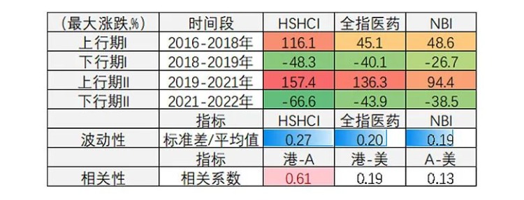 2016-2018年、2019-2021年上行期,港股医药的涨幅都比A股医药和美股生科更猛,2018-2019年、2021-2022年下行期,跌得也更狠。