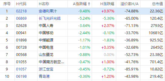 长飞光纤光缆A股跌5.24%,H股现跌5.36%;中国人寿A股跌3.64%,H股现涨2.07%;中国移动A股跌2.44%,H股现跌0.10%。