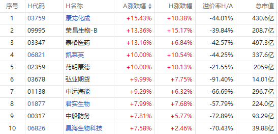 截至发稿,康龙化成A股涨15.43%,H股现涨10.38%;荣昌生物A股涨13.36%,H股现涨15.17%;中远海能A股涨9.29%,H股现涨6.32%。