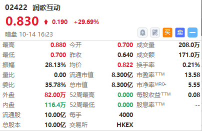 华盛资讯10月14日讯,营销服务提供商润歌互动 $02422.HK 暗盘现涨29.69%,一手账面浮盈近800港元,最新总市值8.3亿港元。该股预计将于下周一(10.17)正式港股挂牌上市。