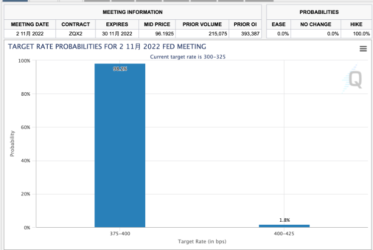 目前,芝加哥商品交易所美联储观察工具显示,市场预期11月再加息75个基点的可能性接近98%。