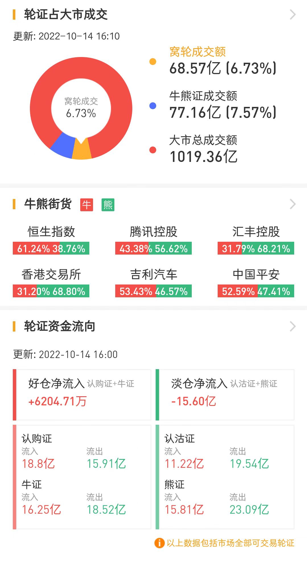 其中,窝轮总成交额为68.57亿港元,牛熊证总成交额为77.16亿港元。