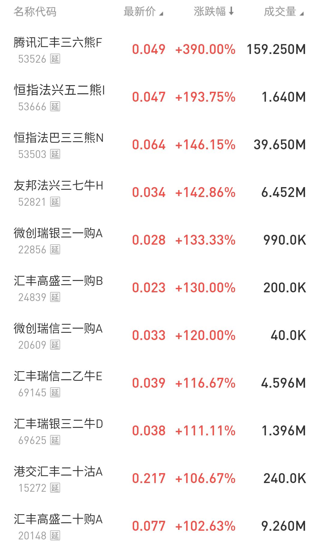 在今日涨幅榜中,腾讯汇丰三六熊F $53526.HK 涨390%,恒指法兴五二熊I $53666.HK 涨193.75%,此外,友邦法兴三七牛H $52821.HK 涨142.86%。