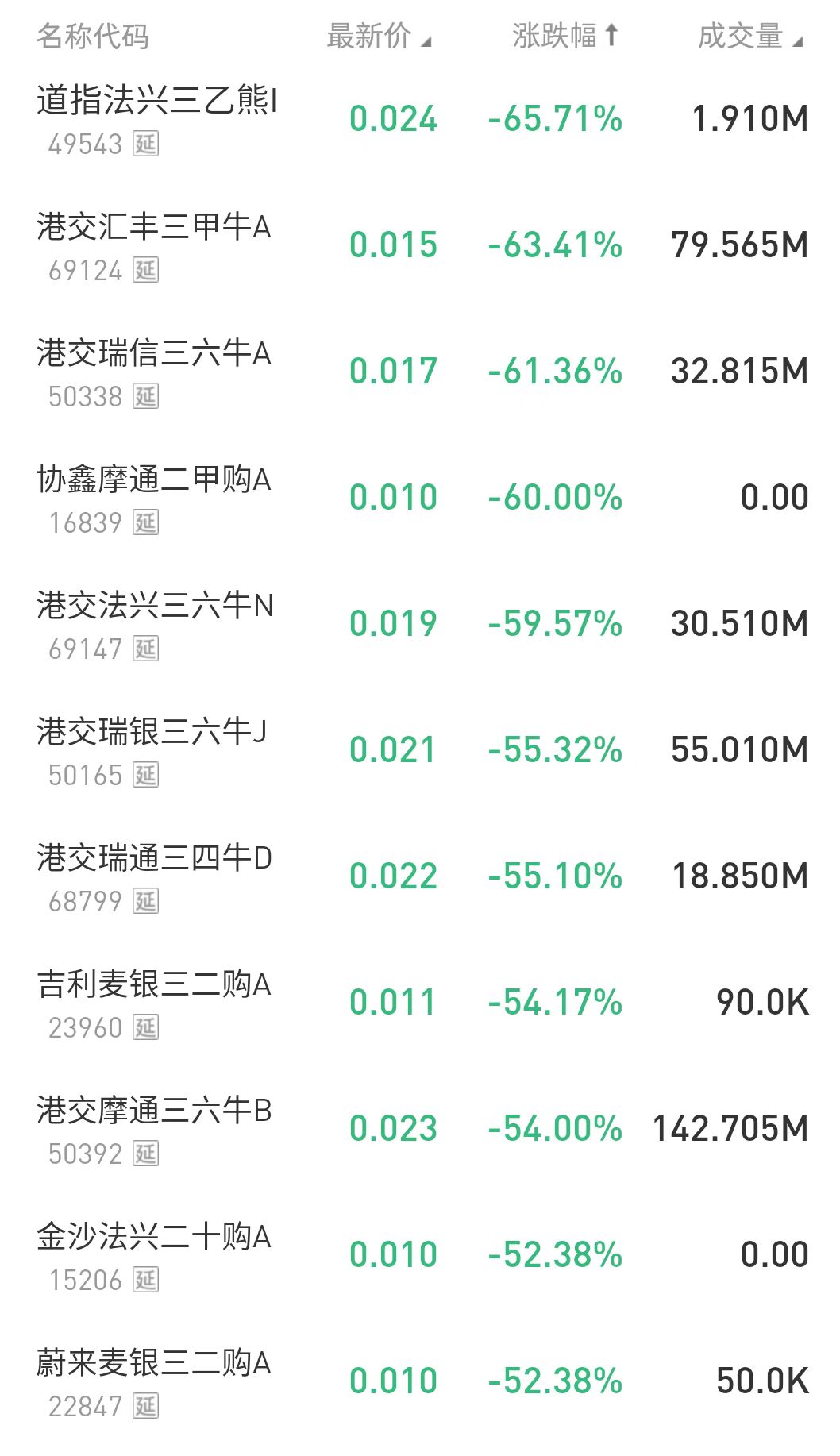 在今日跌幅榜中,道指法兴三乙熊I $49543.HK 跌65.71%;港交汇丰三甲牛A $69124.HK 跌63.41%。
