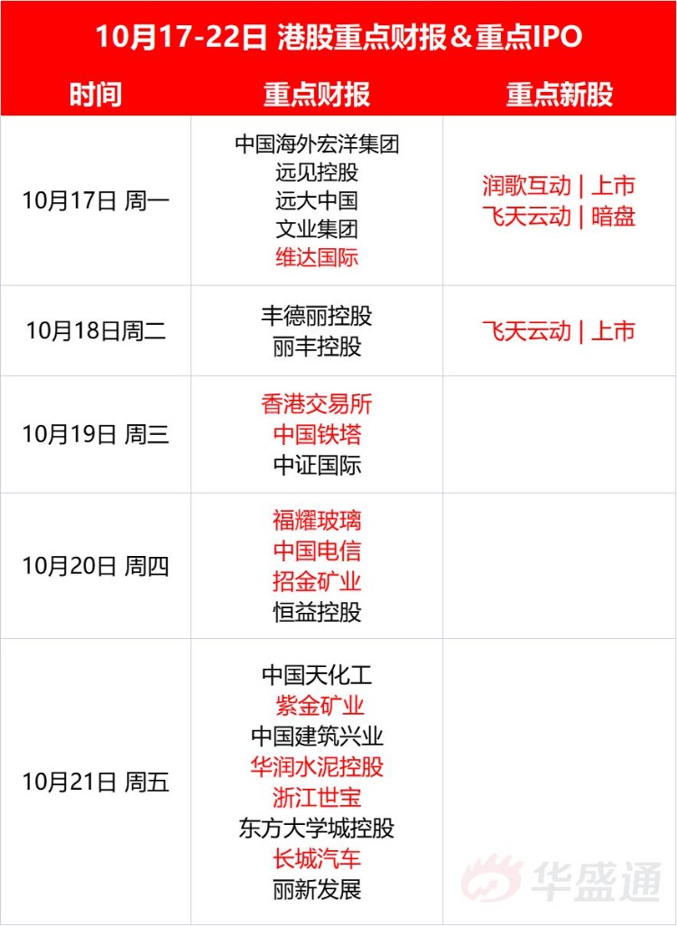 下周将有多家港股公司发布重磅财报,包括周三的港交所,周四的福耀玻璃、中国电信和招金矿业。 新股方面,润歌互动将于下周一挂牌上市,飞天云动将于下周二上市。