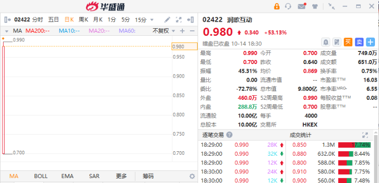 华盛资讯10月14日讯,营销服务提供商润歌互动 $02422.HK 暗盘收涨53.13%,一手账面浮盈1360港元,最新总市值9.8亿港元。该股预计将于下周一(10.17)正式港股挂牌上市。