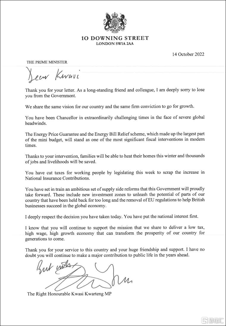 10月14日,特拉斯公布了对刚卸任的前财政大臣夸西·克沃滕的回信。特拉斯表示,克沃滕在“极具挑战性的时期”和“面对严重的全球逆风”的情况下临危受命,她对失去克沃滕这名大臣“深感遗憾”。在最后,特拉斯感谢克沃滕“对这个国家的服务以及你巨大的友谊和支持”。