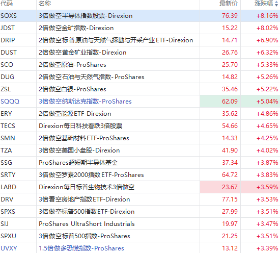 ETF方面,3倍做空半导体指数股票-Direxion $SOXS 涨超8%,2倍做空金矿指数-Direxion $JDST 涨超8%,2倍做空标普原油与天然气-Direxion $DRIP 涨超6%,3倍做空纳斯达克指数-ProShares $SQQQ 涨超5%。