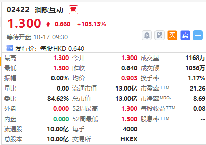 华盛资讯10月17日讯,营销服务提供商润歌互动 $02422.HK 首挂高开103.13%,一手账面浮盈2640港元,最新总市值13亿港元,该股此前暗盘收涨53.13%。