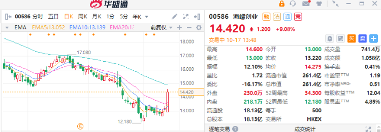10月17日讯,海螺创业(00586)今日逆势走高,截至发稿升超9%,成交额超1.05亿港元。