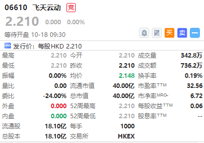 华盛资讯10月18日讯,AR/VR内容服务商飞天云动 $06610.HK 首挂平开,盘前成交额736.2万港元,最新总市值40亿港元,昨日暗盘收跌4.52%。