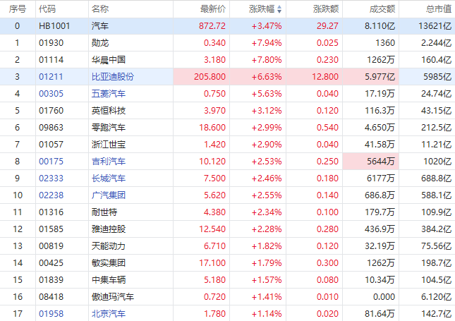 华盛资讯10月18日消息,港股汽车股集体走高,华晨中国涨7.8%,零跑汽车涨近3%,长城汽车、吉利汽车涨超2%,广汽集团涨近2.55%,蔚来跟涨。比亚迪股份高开6.11%,现报205.88港元,成交额5.97亿港元。