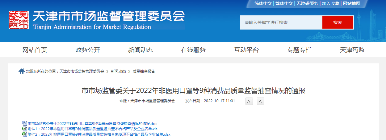 中国质量新闻网讯 10月17日,天津市市场监管委网站通报2022年非医用口罩、护理湿巾等9种消费品质量监督抽查情况。本次抽查天津市10家经销单位的20批次护理湿巾,未发现不合格产品。