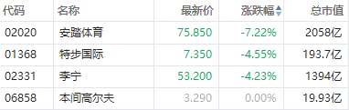 华盛资讯10月18日消息,港股体育用品股走低,截至发稿,安踏体育(02020.HK)跌7.22%、特步国际(01368.HK)跌4.55%、李宁(02331.HK)跌4.23%。