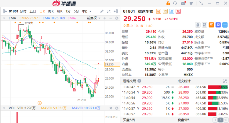 10月18日讯,信达生物(01801.HK)迎来4连升,今日早盘续涨超13%。当前成交额超3.57亿港元。