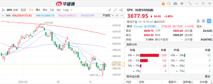 周一(10月17日)美股三大指数再次收涨,纳斯达克指数涨3.43%,标普500指数涨2.65%,道琼斯指数涨1.86%。此前这三大股指在上周四美国CPI公布后经历了大跌,向来被视为是美国股市基准的标普500指数一度跌至2020年11月以来的最低水平,而后在当日强势收涨,不过上周五又重返下跌。