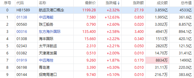 华盛资讯10月19日消息,航运股继续走高,截至发稿中远海能拉升涨超12%,报7.58港元每股,成交额1.99亿港元,近4个交易日累计涨29%;东方海外国际、海丰国际涨超2%,太平洋航运涨2.21%,中远海控涨1.87%。