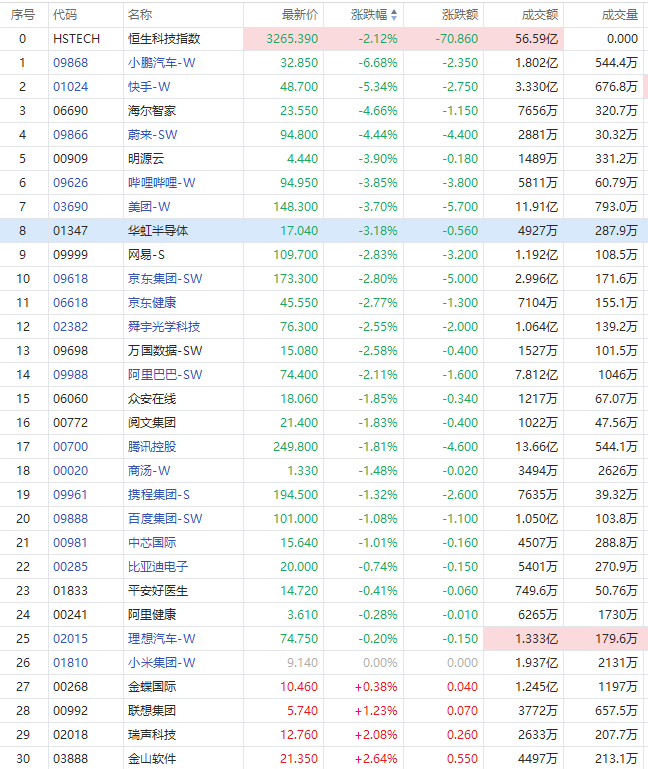 小鹏汽车-W跌超6%,股价接近此前历史低位;科网股集体走弱,快手-W跌超5%,哔哩哔哩-SW、美团-W跌超3%,京东集团-SW、阿里巴巴-SW跌超2%,腾讯控股现跌1.81%。
