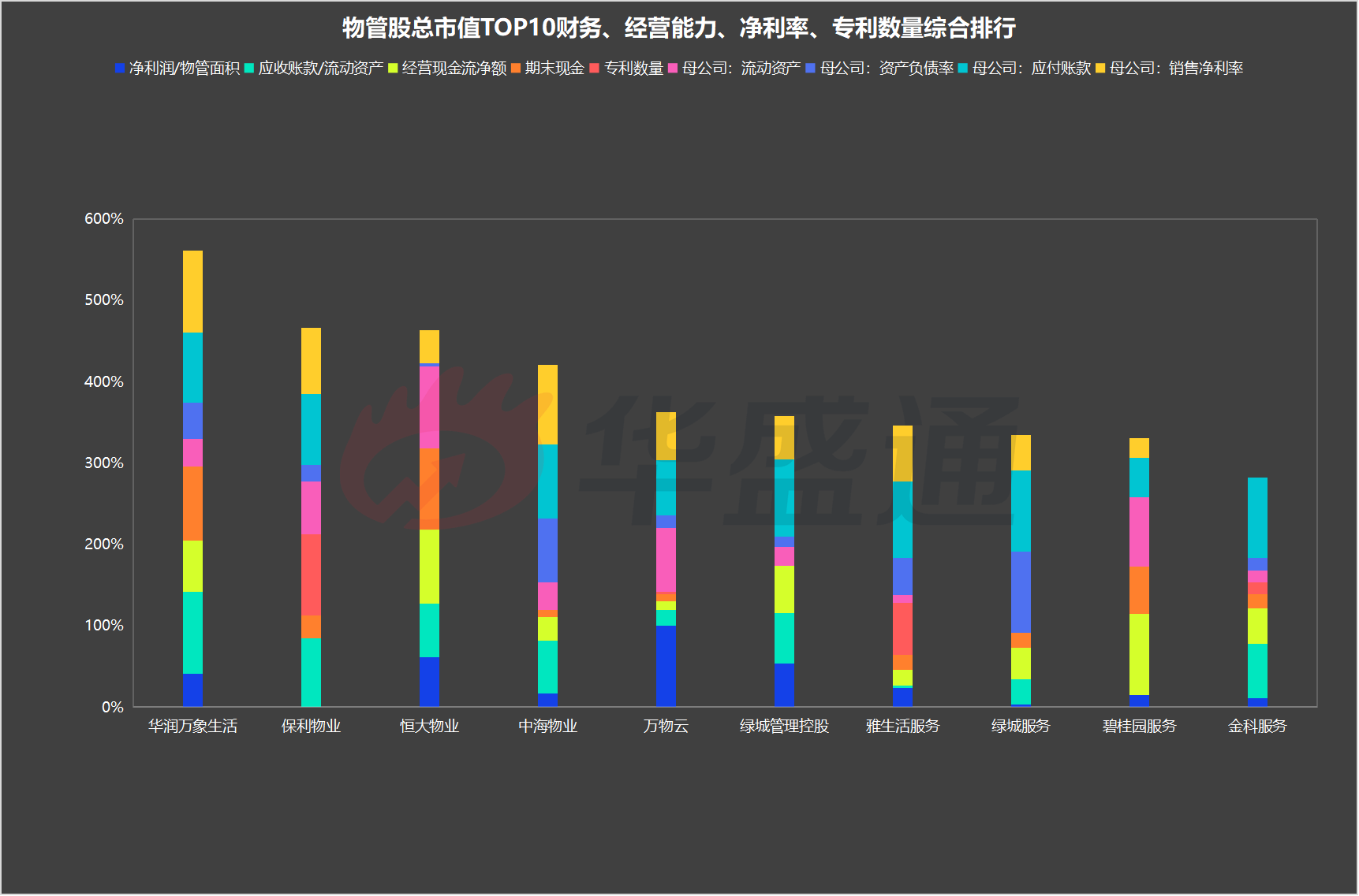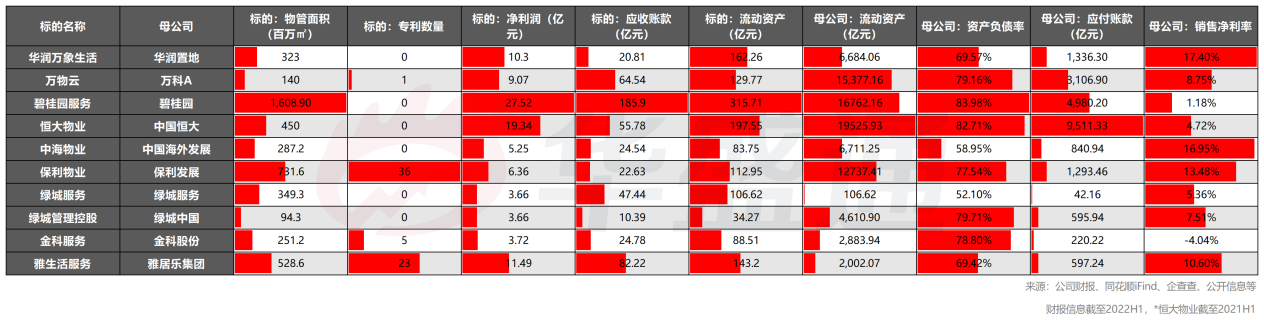 我们筛选了物管股的市值TOP10;再根据他们在不同维度上表现的分位打分,包括母公司流动资产、资产负债率、应付账款、净利润率,以及物管公司的应收账款/流动资产、净利润率/物管面积、经营现金流、期末现金净额这几个指标;拥有的专利数量则是财务指标外的加分项。在这方面,应收账款、应付账款以及资产负债率会导致扣分。