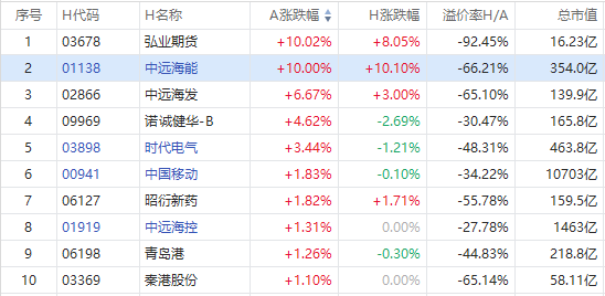 截至发稿,弘业期货A股涨停,H股现涨8.05%;中远海能A股涨停,H股现涨10.1%;中远海发A股涨6.67%,H股现涨3%。