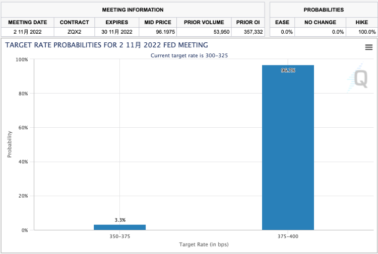 目前,芝加哥商品交易所美联储观察工具显示,市场预期11月再加息75个基点的可能性接近96%。