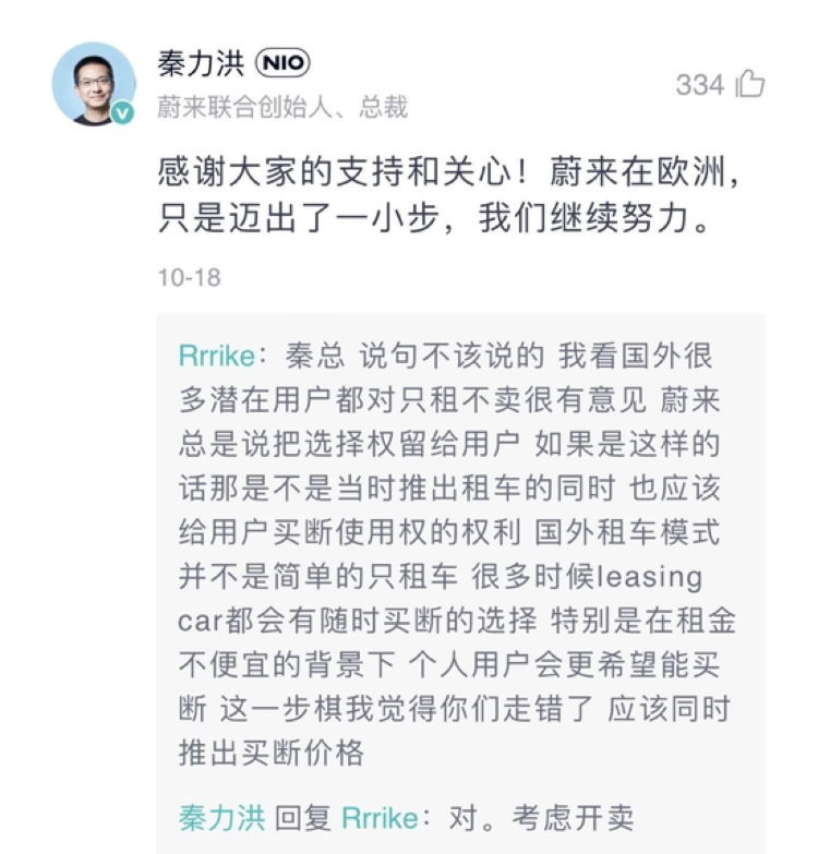 10月18日,针对网友所提蔚来汽车应在欧洲放弃“只租不卖”、提供“买断”选择的建议,蔚来汽车总裁秦力洪在用户App中回应称“考虑开卖”。