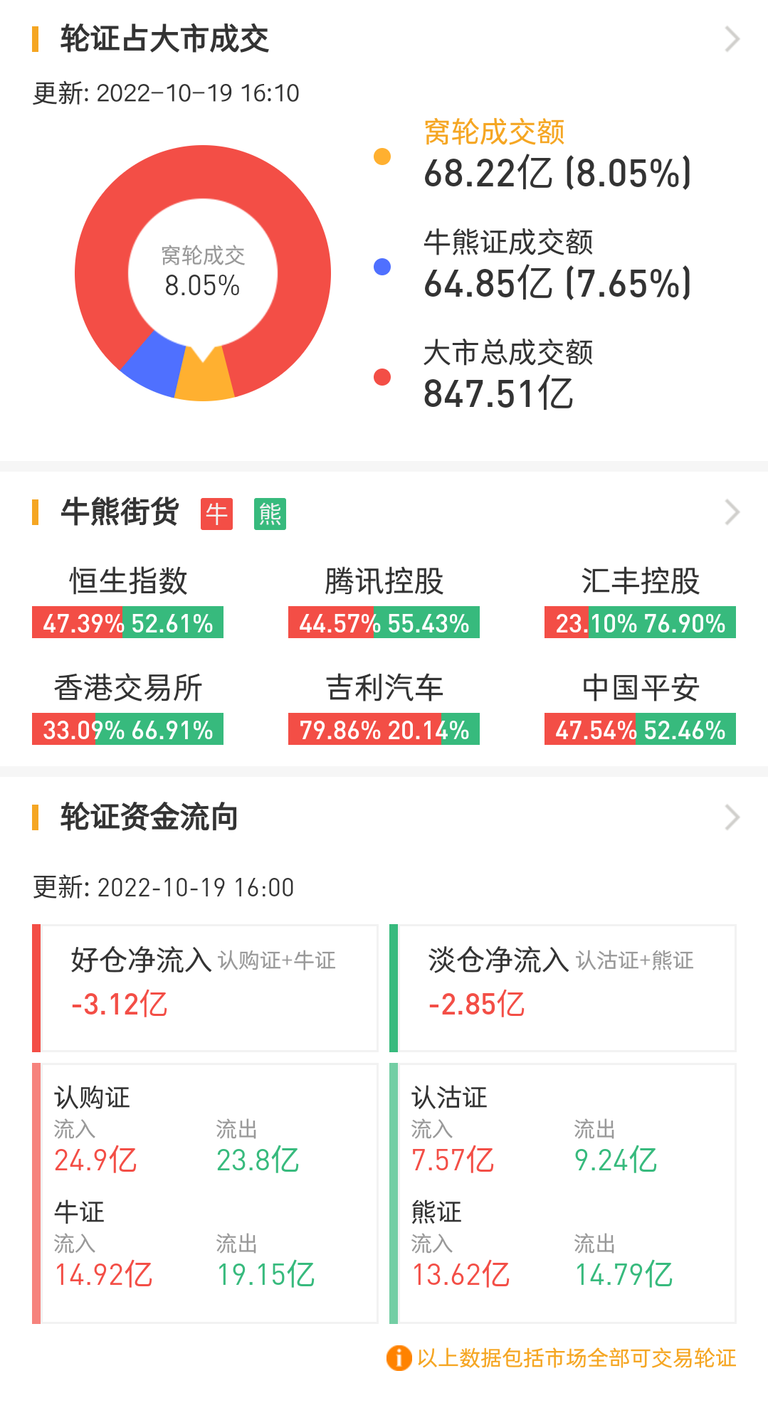 其中,窝轮总成交额为68.22亿港元,牛熊证总成交额为64.85亿港元。