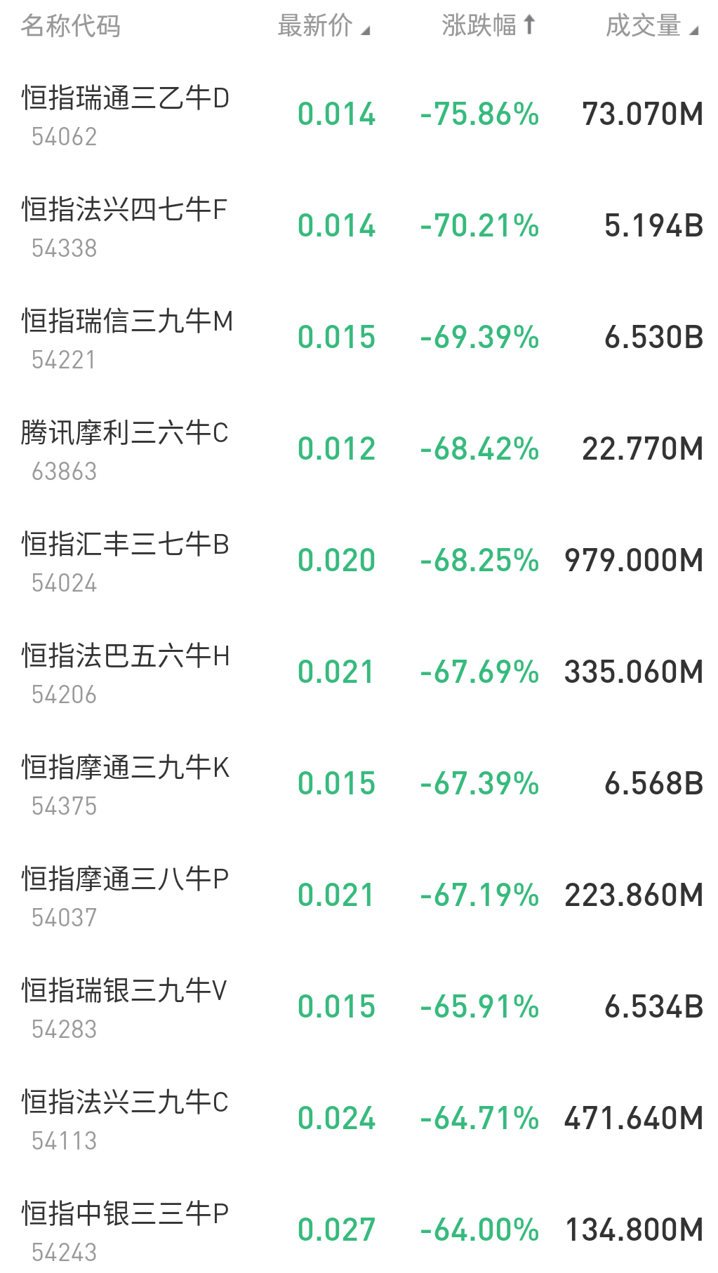 在今日跌幅榜中,恒指瑞通三乙牛D $54062.HK 跌75.86%;腾讯摩利三六牛C $63863.HK 跌68.42%。