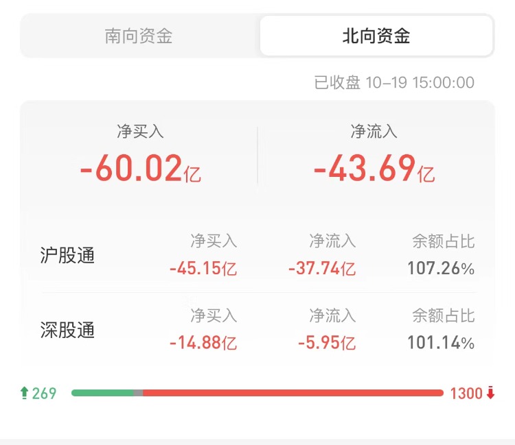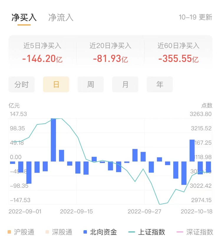 北上资金今日净卖出60.02亿元,沪股通净卖出45.15亿元,深股通净卖出14.88亿元。上一交易日净卖出37.57亿元。