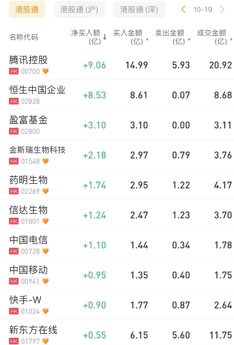 南下资金净买入腾讯控股 $00700.HK 9.06亿港元,恒生中国企业 $02828.HK 8.53亿港元。此外,盈富基金 $02800.HK 获净买入3.1亿港元,金斯瑞生物科技 $01548.HK 获净买入2.18亿港元。