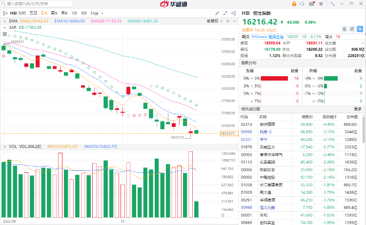 10月21日,港股震荡走弱,恒指跌0.48%,网易、李宁跌超3%;恒生科技指数跌0.32%,成分股中,快手跌3.67%,蔚来、理想跟跌。