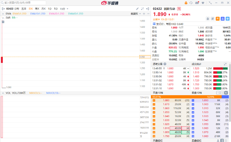 华盛资讯10月20日消息,次新股润歌互动午后一度涨超40%,最高触及1.95港元,较IPO发行价涨幅超过200%,创历史新高。现涨36.96%,报1.89港元每股,成交额3019万港元。