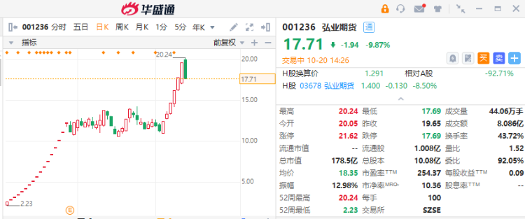 据同花顺数据显示,截至10月19日,弘业期货A股、H股的股价溢价超过1200%,是目前A+H两地上市的个股中AH溢价最高的个股。